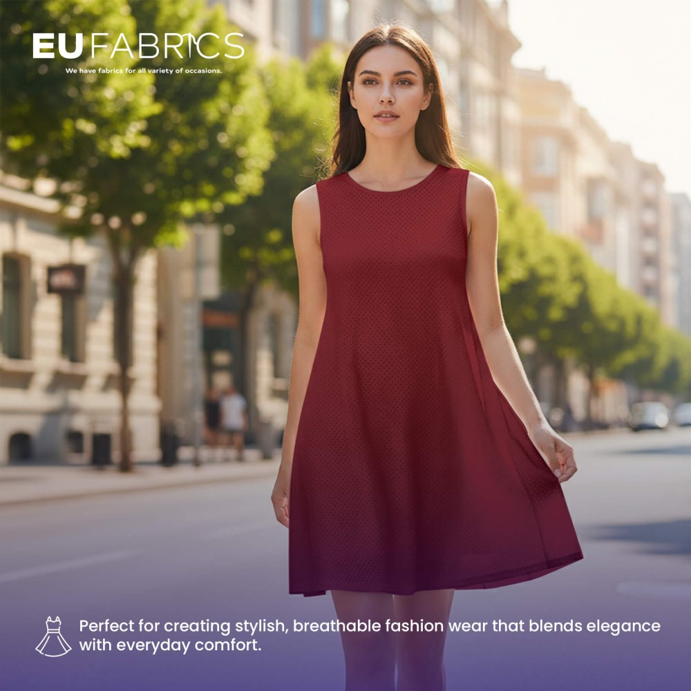 Wine airtex mesh fabric features a classic fish net design with open holes that allow excellent airflow while maintaining structure. The deep wine shade adds richness and depth, making it a strong choice for both performance wear and fashion pieces. This polyester airtex fabric is lightweight yet durable, offering flexibility without compromising strength.