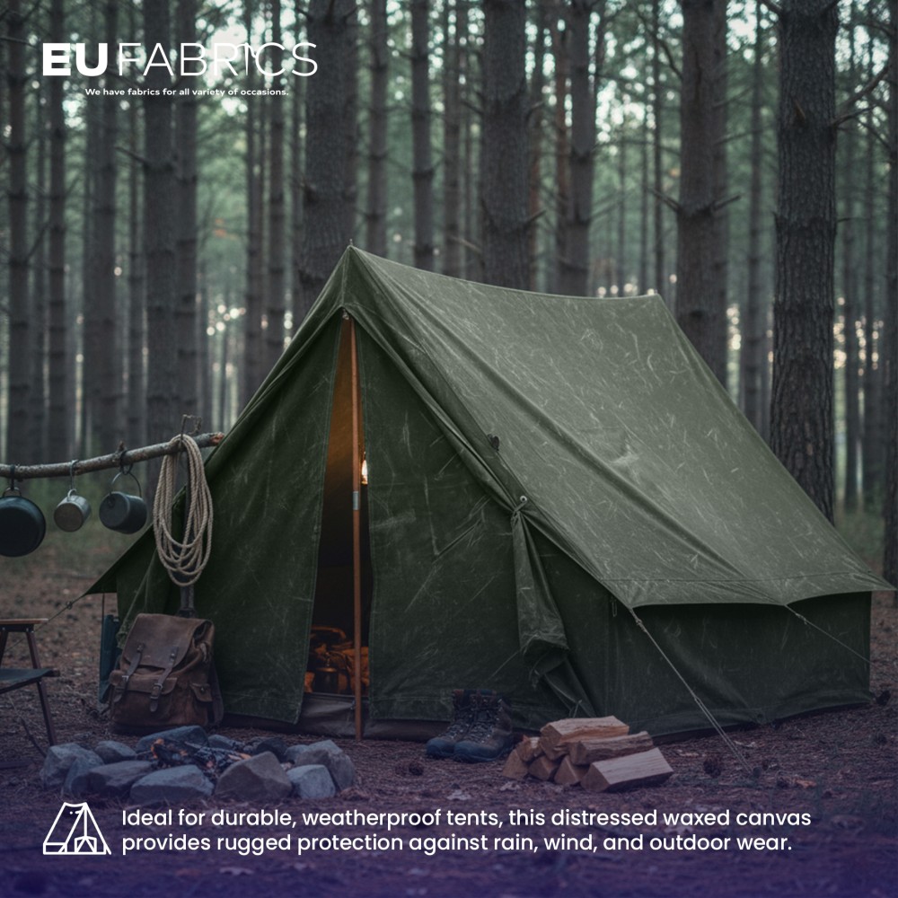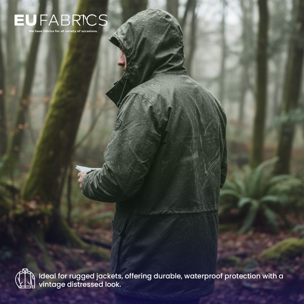 Designed for both function and style, this distressed waxed cotton fabric offers a distinctive worn look while maintaining strength and durability. The tightly woven base combined with a waxed coating provides dependable protection against moisture, making it a trusted waterproof canvas fabric for a wide range of uses. Its textured finish adds character to every piece, whether used for garments or accessories.